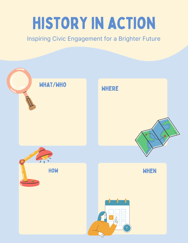 Young trailblazers! Ever wondered how you can shape the future? Join our live webinar where we unravel history’s tales and discuss how your voice can drive change today. You will learn how to use primary and secondary sources to conduct historical research and have an opportunity to brainstorm creative ways to get involved in civic engagement everyday. Let’s ignite change, one idea at a time! 🌟
